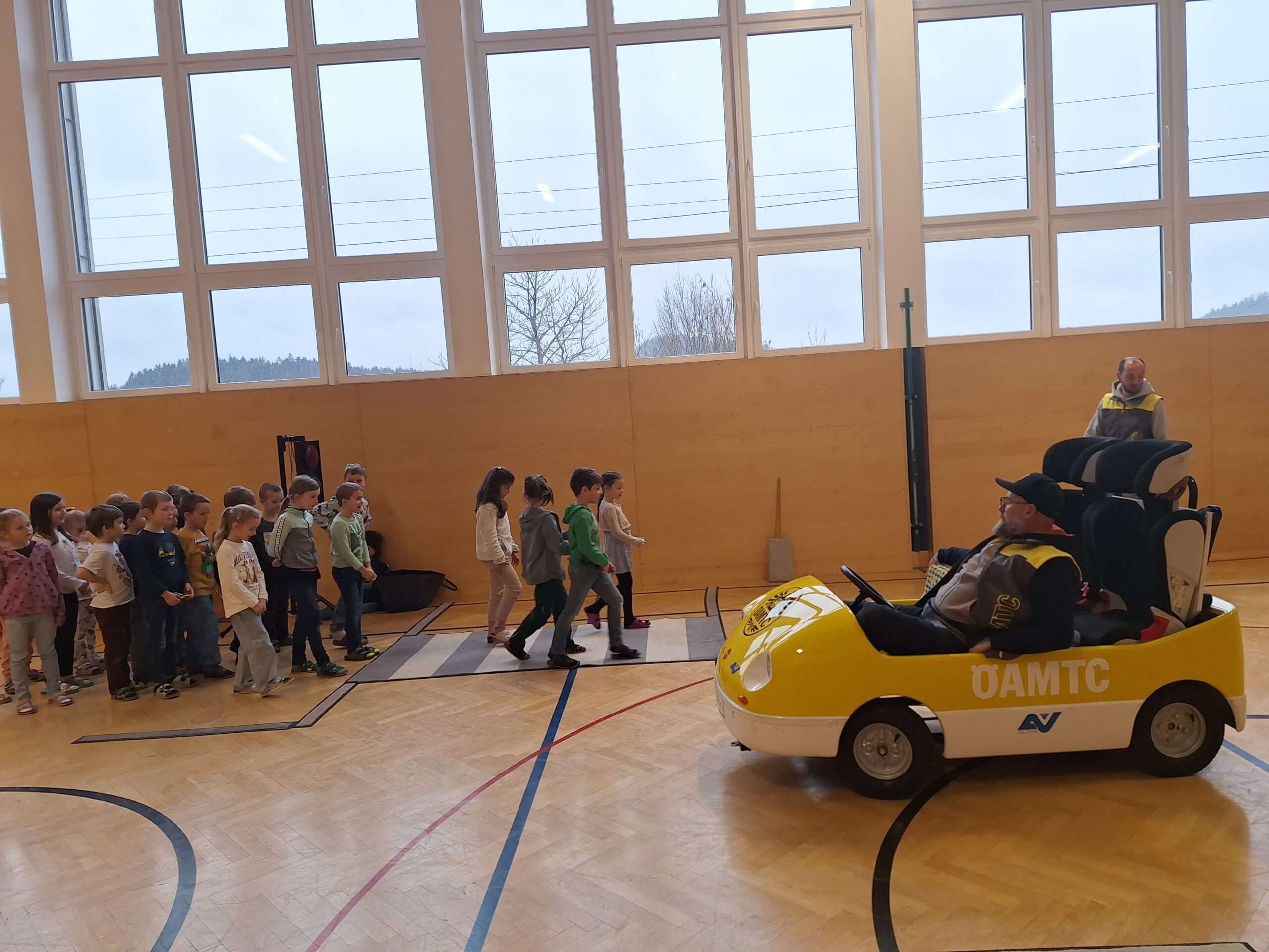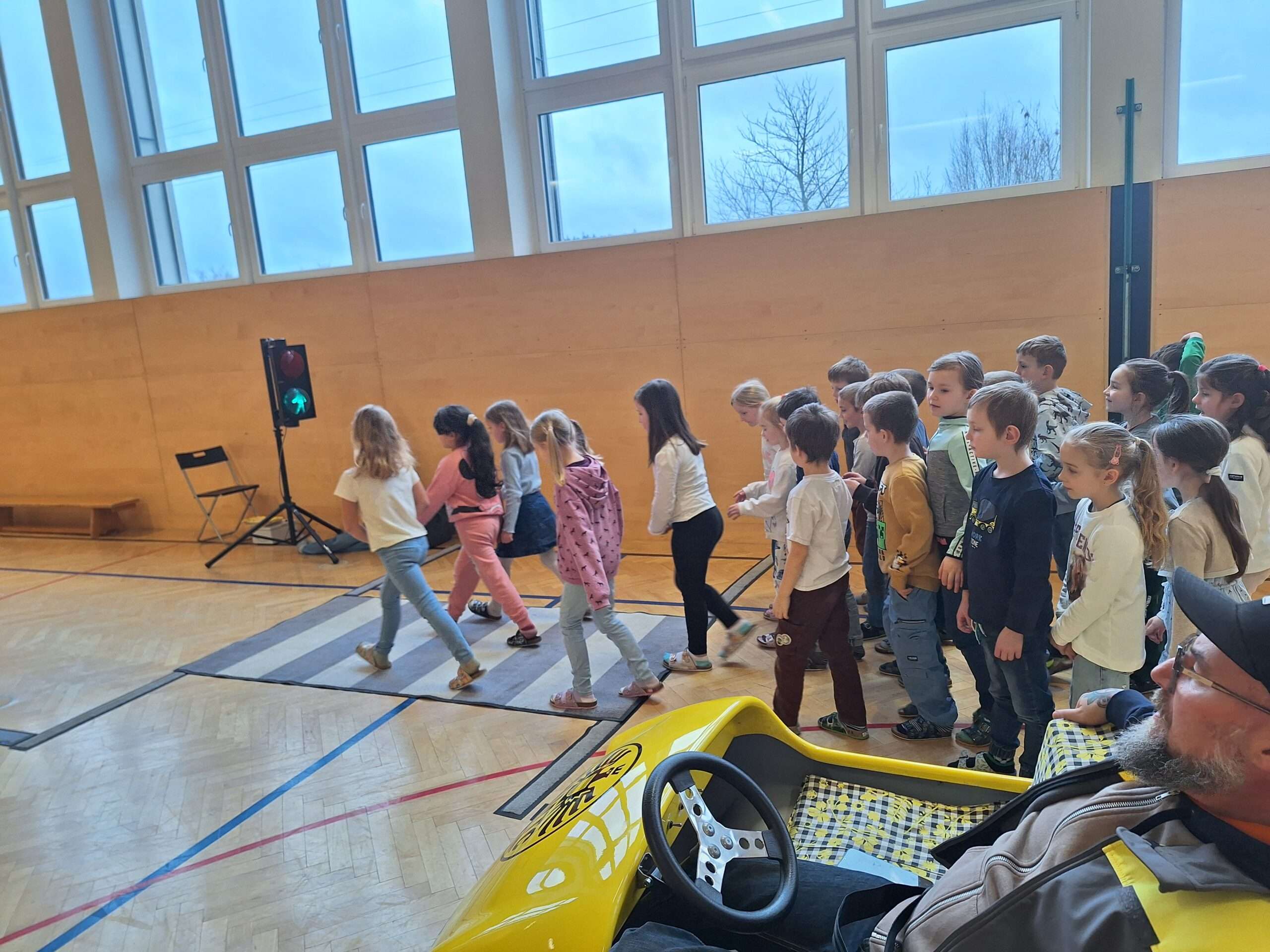 Die Kinder der 1. Klasse übten mit der Polizistin das sichere Überqueren der Straße.